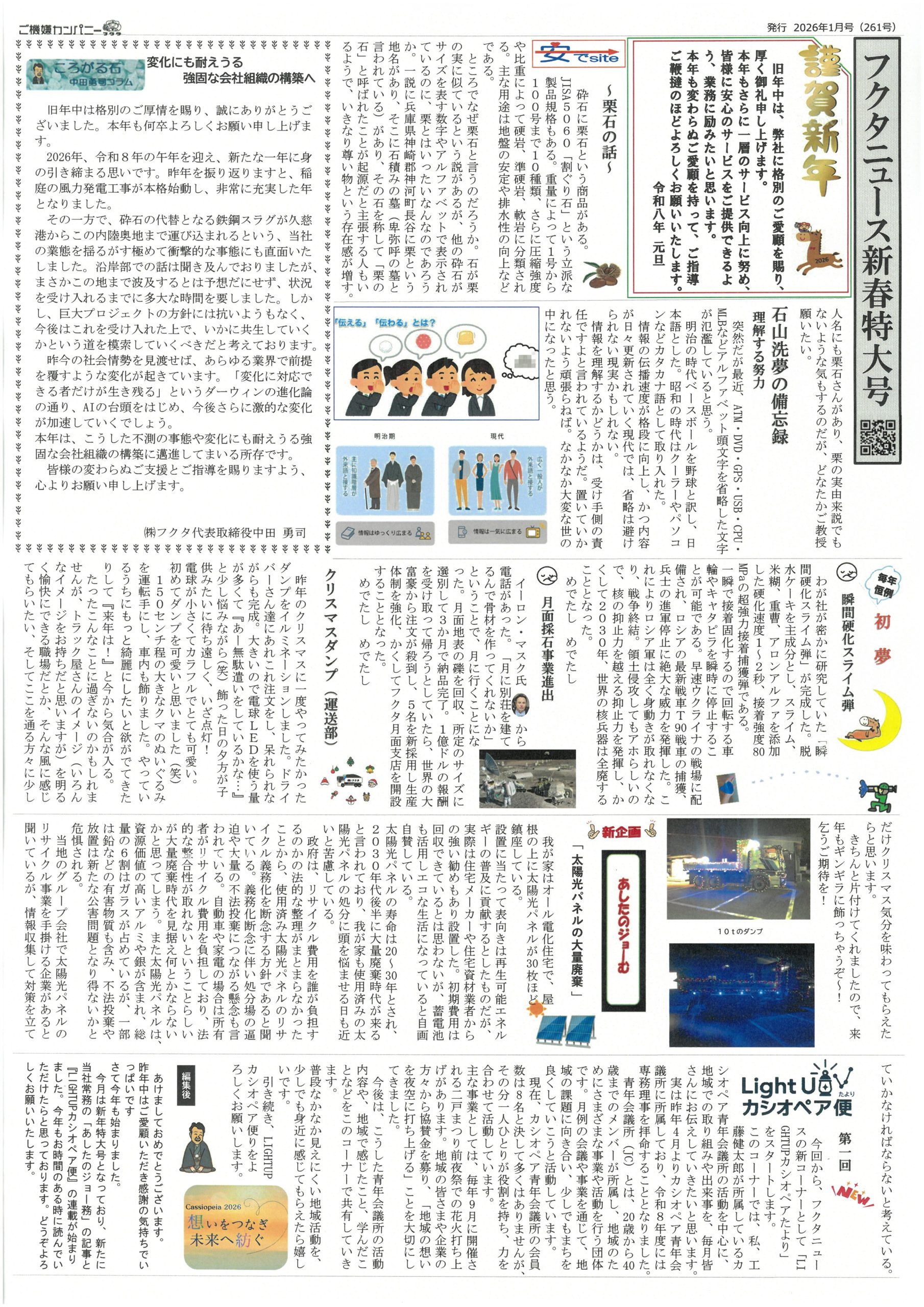 おしらせ フクタ通信令和8年1月号を発行・掲載しました 2026年1月7日 2026年1月7日 Hukuta-AdministratoR2170 新年あけましておめでとうございます。 フクタ通信新年1月号を発行いたしましたのでぜひご覧くださいませ! ※拡大表示する場合は「右クリック→新しいタブで画像を開く」とすると任意の倍率で閲覧いただけます。 過去のフクタ通信一覧